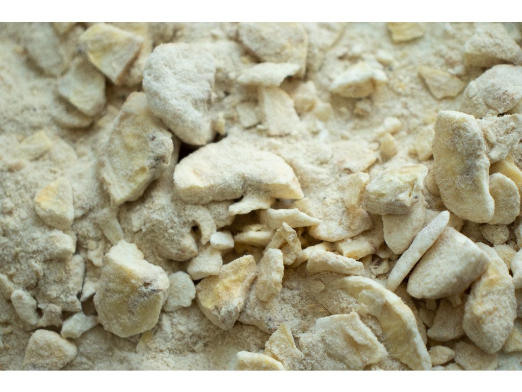 Má stejně prospěšné vlastnosti jako celé plátky lyofilizovaného banánu, jedná se o úlomky a prášek ze stejného ovoce. Můžete si tak být jistí, že v každé lžíci prášku se ukrývá spoustu vitamínů a minerálů. Prášek z mrazem sušených banánů neobsahuje žádný přidaný cukr, tuk ani jiná aditiva.