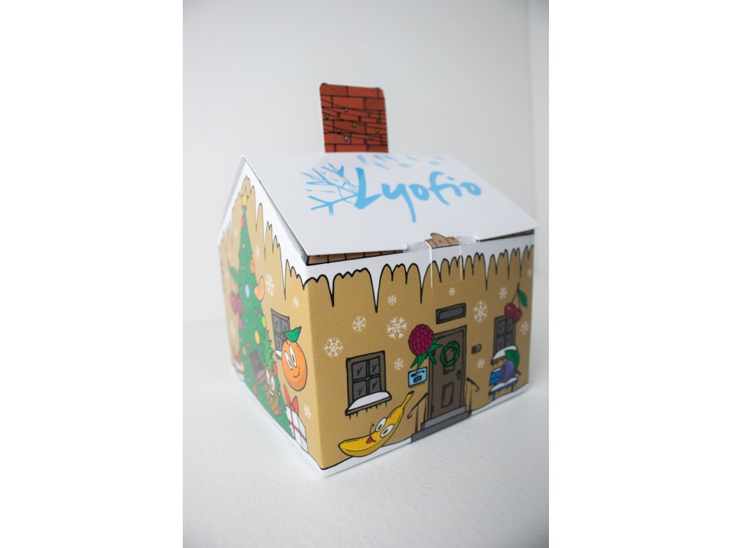 V každém domečku se nachází mix lyofilizovaného ovoce v čokoládě z naší nabídky: