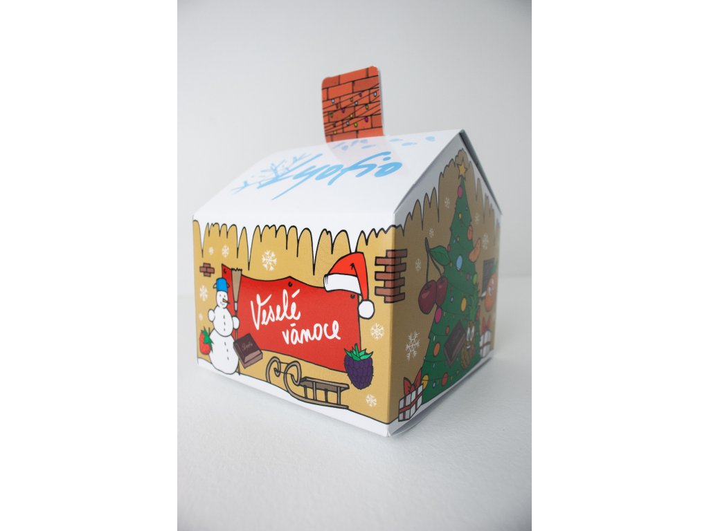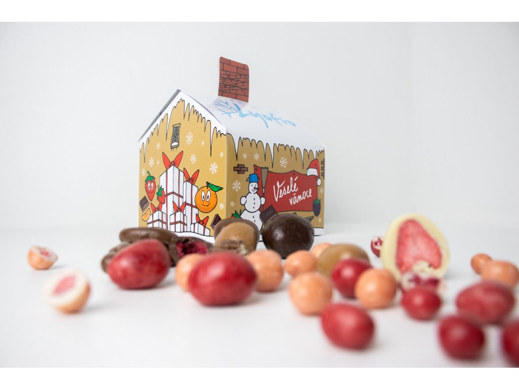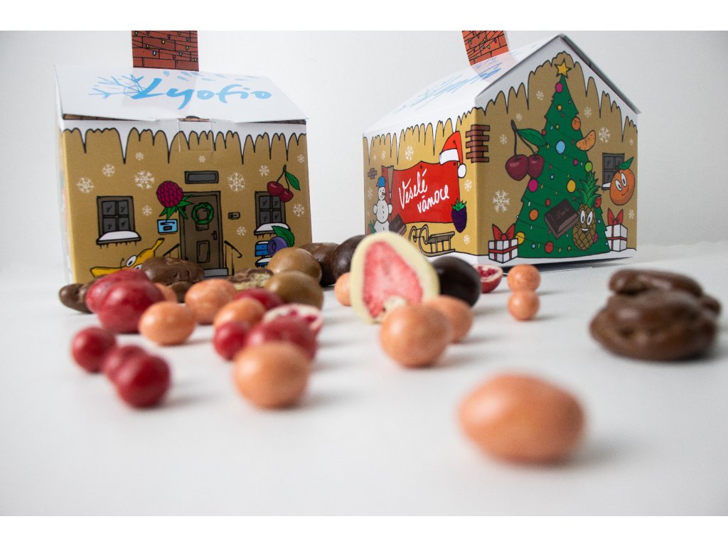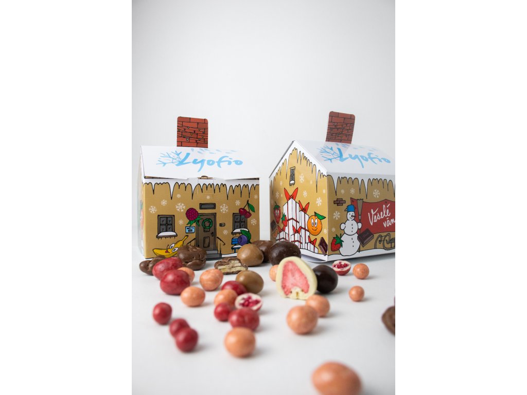 V každém domečku se nachází mix lyofilizovaného ovoce v čokoládě z naší nabídky: