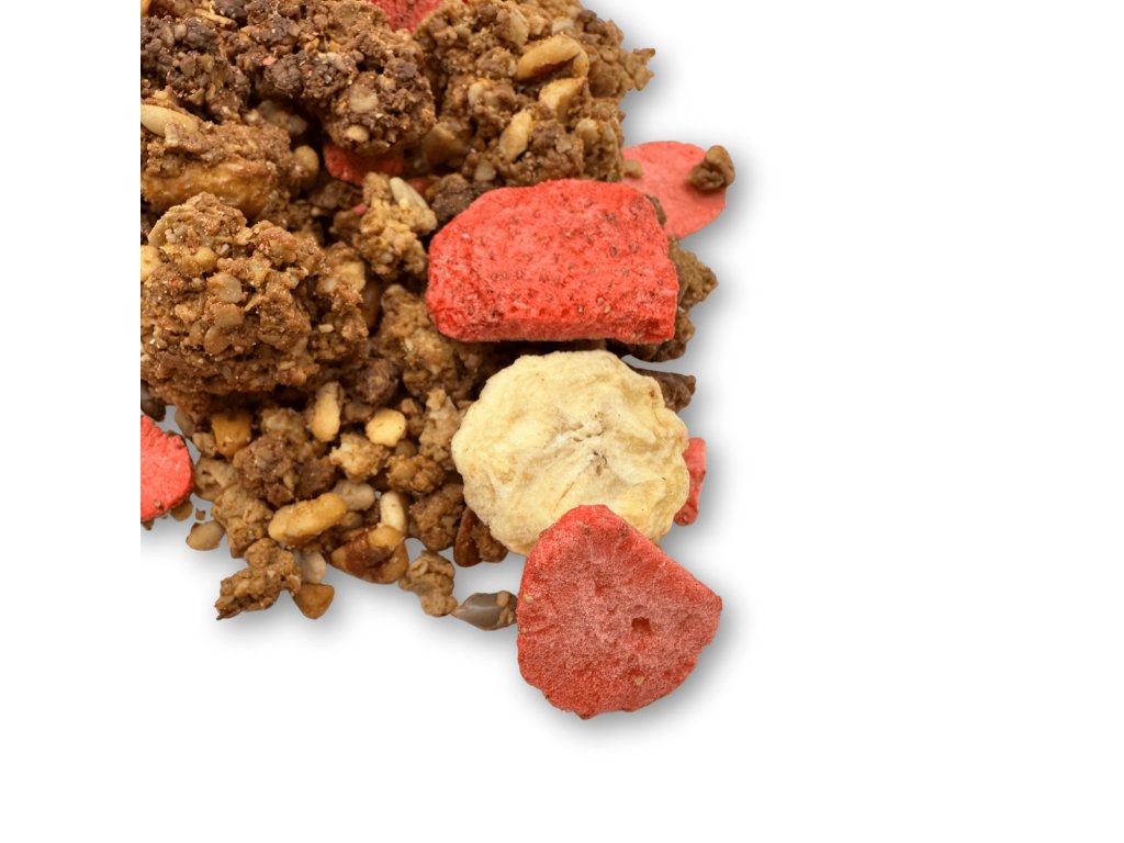 - Lyofilizované jahody a banán – pro výraznou ovocnou chuť a porci vitamínů