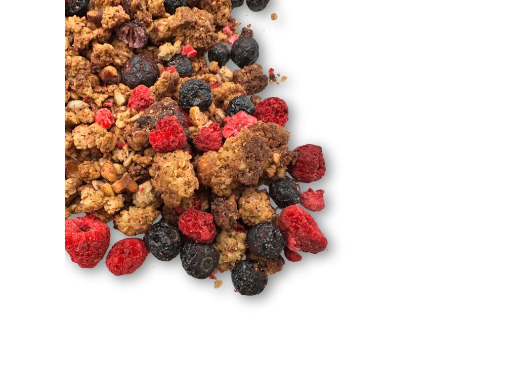 - Lyofilizované maliny a kanadské borůvky – pro svěží ovocnou chuť a porci vitamínů