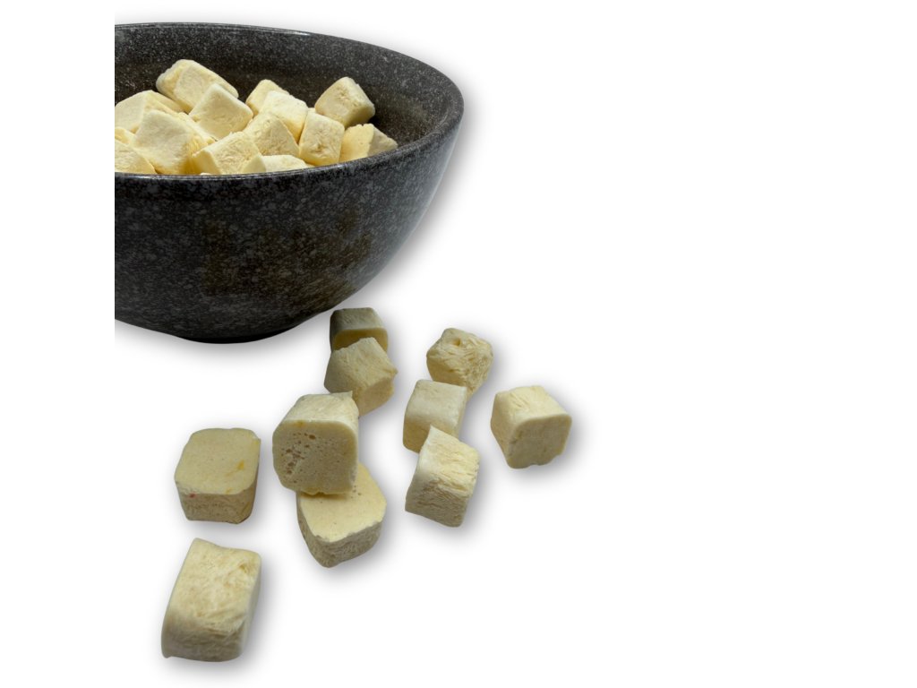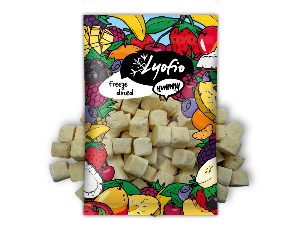 - 100 % přírodní produkt: Na výrobu čtverečků se používají jen dvě suroviny – mrazem sušené kokosové mléko a prášek z mrazem sušených broskví. Nic víc není potřeba.