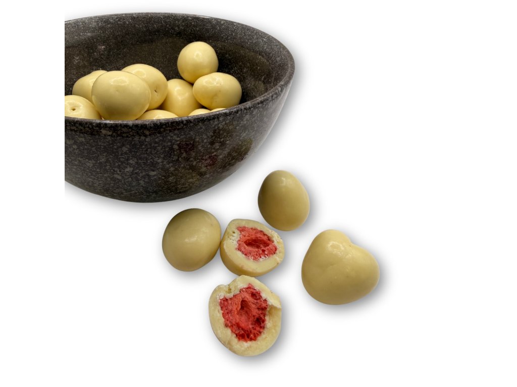 Základem každé kuličky je celá lyofilizovaná jahoda. Krásné velké jahody se vysuší mrazem a opatrně se obalí v bílé čokoládě. Pod křupavou čokoládou na vás nečeká žádná drť, ale celé ovoce. Lyofilizované jahody v čokoládě vám tak chuťově nahradí čerstvé jahody v čokoládě. Kromě toho přidají ještě báječnou křupavost a dlouhou trvanlivost.