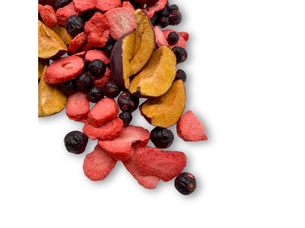 Zahradní směs neobsahuje žádný přidaný cukr, konzervanty ani jiná aditiva. V sáčku najdete jen ovoce, které nejdřív krásně uzrálo a potom bylo šetrně usušené mrazem.