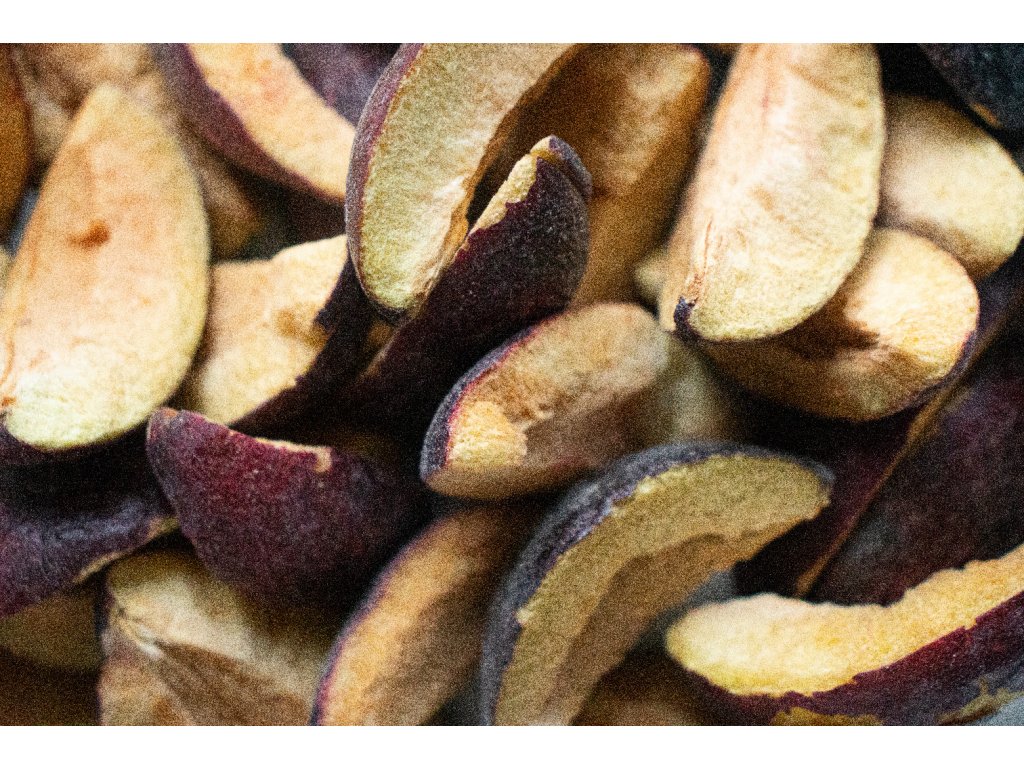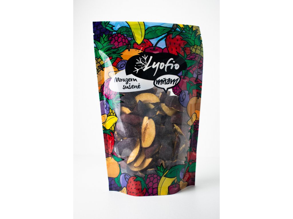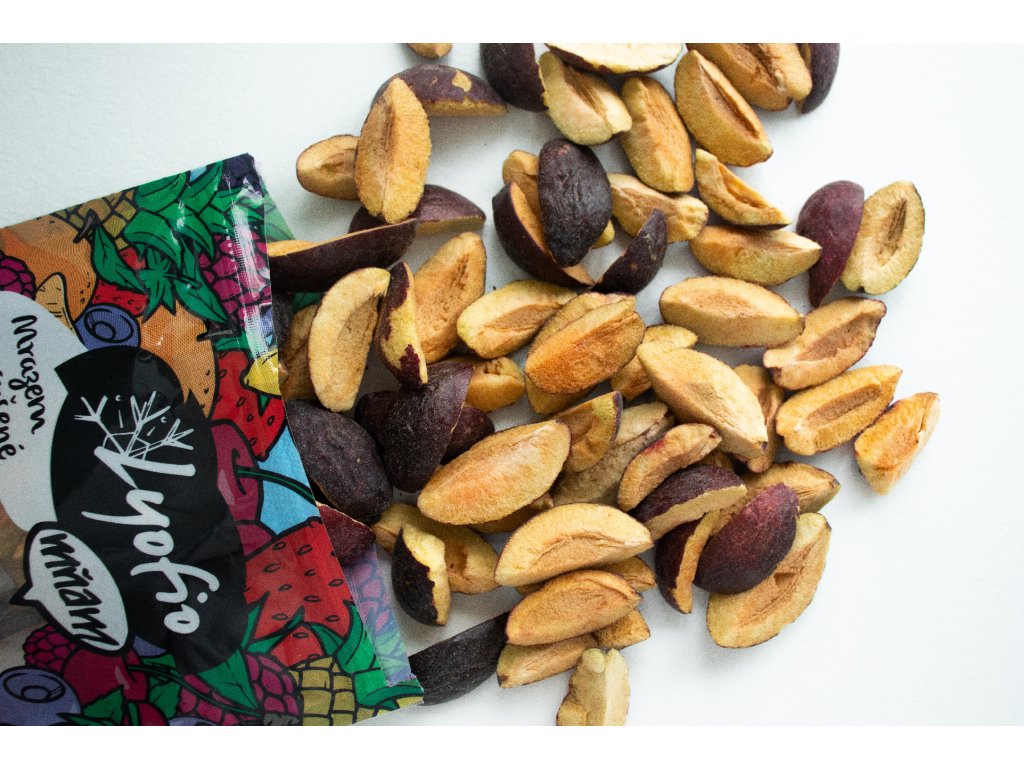 Lyofilizované ovoce nemusí pocházet z tropů, sušení mrazem si poradí i s ovocem, které známe z našich zahrádek. Mrazem sušené švestky tak v naší nabídce nesmí chybět. Chutnají jako právě utržené, a navíc si zachovaly vitamíny, minerály a další prospěšné látky téměř jako čerstvé plody. Za zmínku stojí také vysoký obsah vlákniny – díky tomu vás lyofilizované švestky zasytí a přispívají k dobrému trávení.